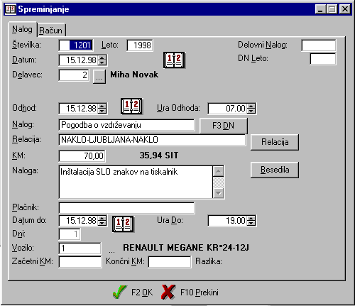 - Uporabljamo lahko šifrant že prej pripravljenih relacij z kilometri in opisi najpogostejših delovnih nalog.