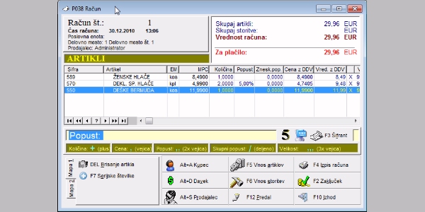 - Uvedba kartice zaupanja – Izdaja kartice za stranke (kartica podpira 13. mestno EAN kodo) in upravljanje popustov za vsako kartico. Možnost pregledov prodaje za posamezno kartico, seštevanje nakupov in vodenje pravljenega prometa v obliki točk